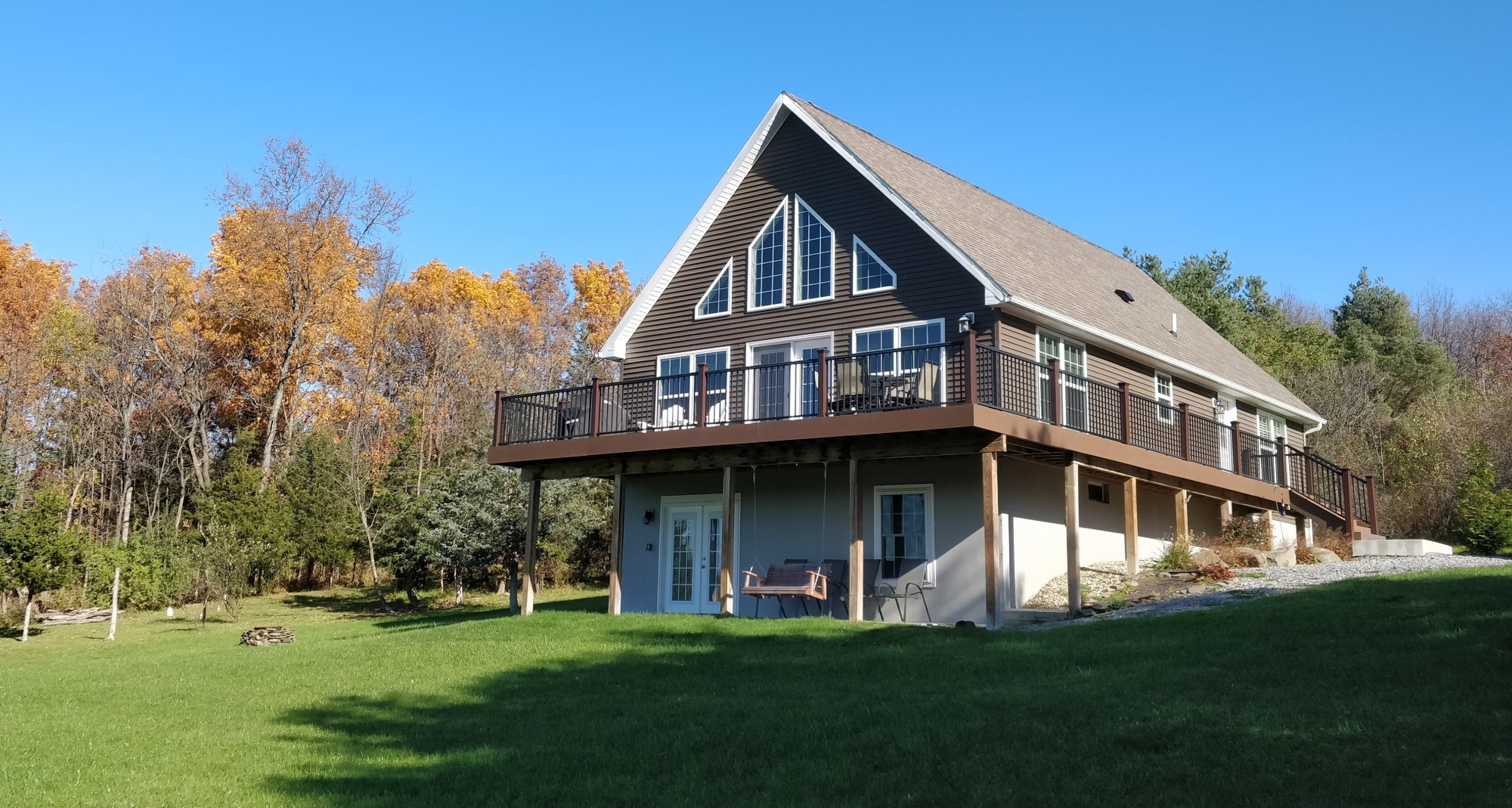 This newly built chalet nestled on private and spacious 5 acres on the east side of Seneca Lake in the heart of the Finger Lakes Wine Country offers a great vacation spot. Located along the Seneca Lake Wine and Beer Trail, a short walk from Damiani Wine Cellars and Finger Lakes Distilling, and several wineries and breweries within minutes. The open floor plan home with windows on all walls of the great room/dining area makes it a perfect place for families and groups. The large deck invites you to enjoy the spectacular sunset views of Seneca Lake.